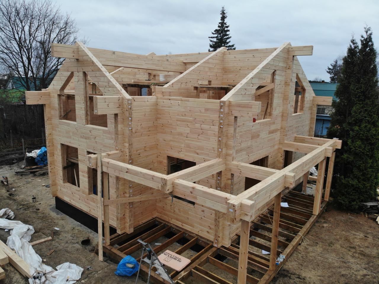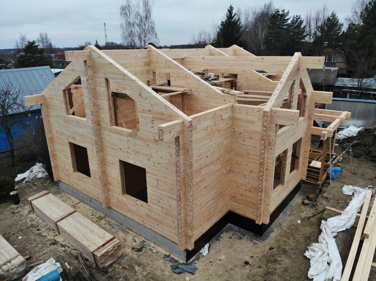 Это полностью индивидуальный проект нашего заказчика. Общая площадь дома составляет 182,8 квадратных метров. В строительстве мы использовали клееный брус собственного производства из сосны сечением 205х185(h) мм.