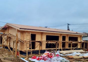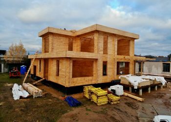 Наша бригада ведет работы по сборке сруба дома. В строительстве мы используем клееный брус собственного производства из сосны сечением 205х270(h) мм. За основу проекта был взят наш типовой проект Турин, но заказчик внес свои индивидуальные изменения. Общая площадь дома составляет 424,61 м2.