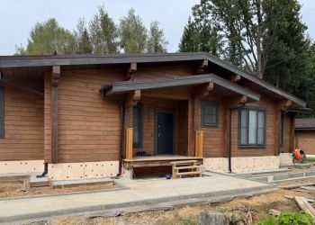 Выполнили заливку отмостки и дорожек. Дом построен по нашему типовому проекту Анси с индивидуальными изменениями планировки.