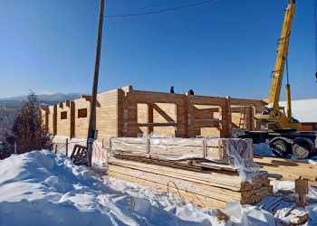Завершили сборку сруба и монтаж стропильной системы в селе Манжерок, республика Алтай
