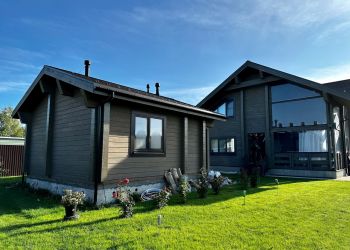 Площадь первого здания составляет 354 квадратных метра. Всего будет построено 3 здания из клееного бруса по индивидуальному проекту нашего заказчика. В строительстве мы используем клееный брус собственного производства из сосны с сечением 185х285 мм.