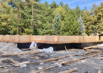 На участке мы выполним строительство 3 зданий — гараж, дом и баня. Полностью индивидуальный проект, который мы разработали для нашего заказчика. Сейчас ожидаем поставку клееного бруса и приступаем к сборке сруба. Пока что наша бригада выполняет подготовительные работы на участке.