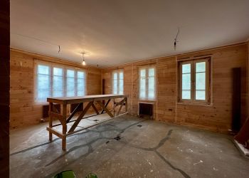 Сейчас наша бригада завершила окрашивание и мы приступаем к внутренним черновым работам.Площадь гаража составляет 70,5 квадратных метров. В строительстве мы использовали клееный брус собственного производства из сосны с сечением 205х185 мм.