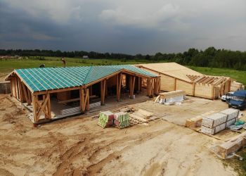Сейчас наша бригада выполняет работы по сборке сруба дома. Это полностью индивидуальный проект нашего заказчика. Общая площадь дома составляет 186,85 квадратных метров. В строительстве мы будем использовать клееный брус собственного производства из сосны сечением 205х185 мм.