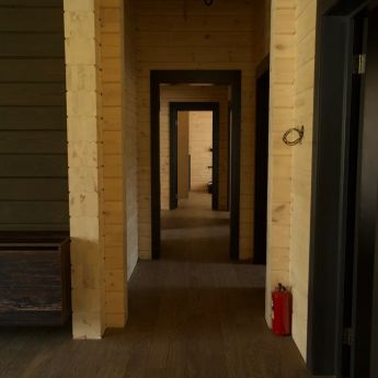 • стеновой комплект: брус клееный 185(h)х205 мм (сосна) с конструкционным запилом чашек под архитектурно-планировочное решение Заказчика