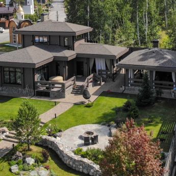Этот двухэтажный дом с благоустроенной приусадебной территорией создан для комфортной жизни за городом. Как приятно вечером после работы спрятаться от суеты на веранде дома. А в выходные собрать семью и друзей за круглым столом беседки и провести время у открытого огня на костровой площадке в саду.