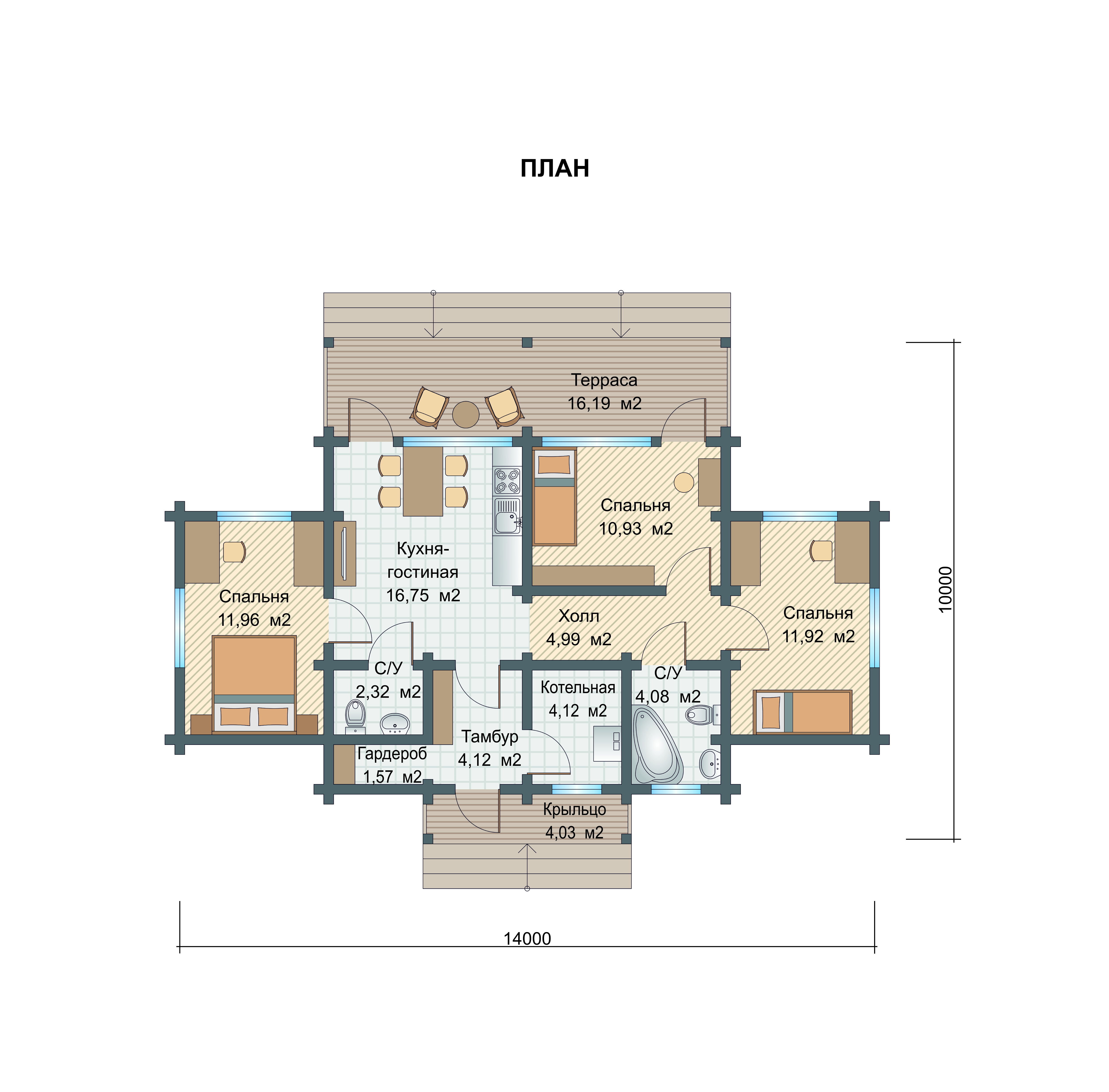 По проекту в доме есть 3 спальни, 2 санузла, гардероб, котельная и кухня-гостиная.