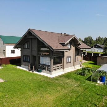 Дом из клееного бруса в Подмосковье 166 м2. По проекту дом - двухэтажное здание, с террасой. В доме расположены 4 спальни.