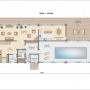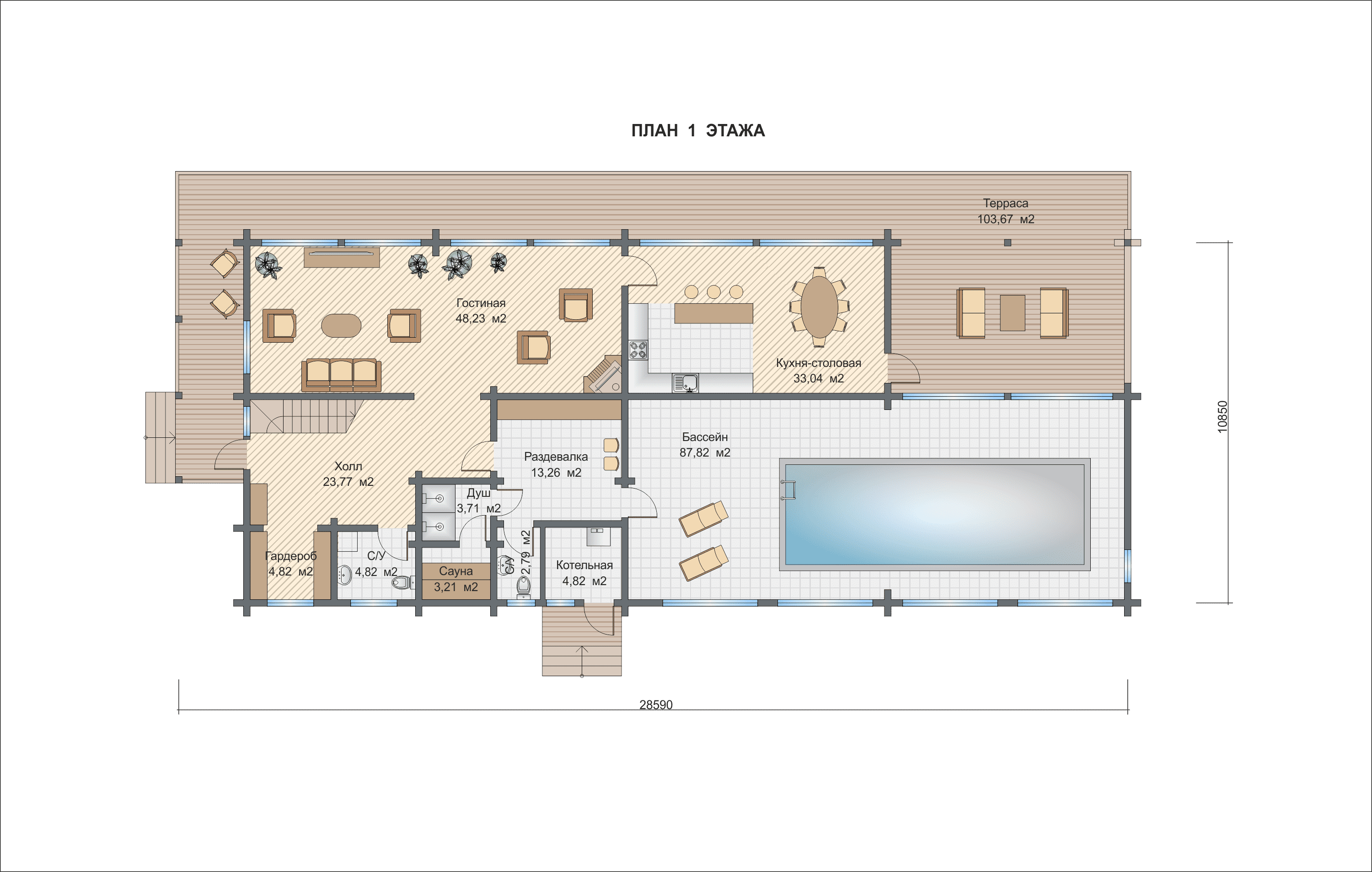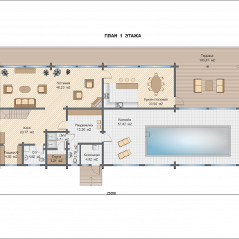 В доме есть большая гостиная. Второй свет в совокупности с большой площадью остекления создает уютную атмосферу. Изюминкой проекта «Флорида» является наличие бассейна, площадь зоны бассейна – 87,82 кв.м. Рядом с бассейном есть все необходимые помещения для комфортного пребывания.