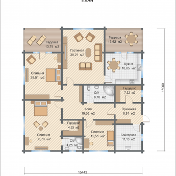 Полезная площадь проекта "Штутгарт" - 224 кв.м. По проекту "Штутгарт" - одноэтажное здание, которое оснащено большой террасой. Площадь террас составляет - 27,36 кв.м.