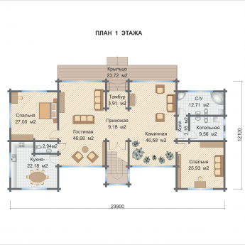 Также, в доме есть большая гостиная, совмещенная с кухней-столовой.
