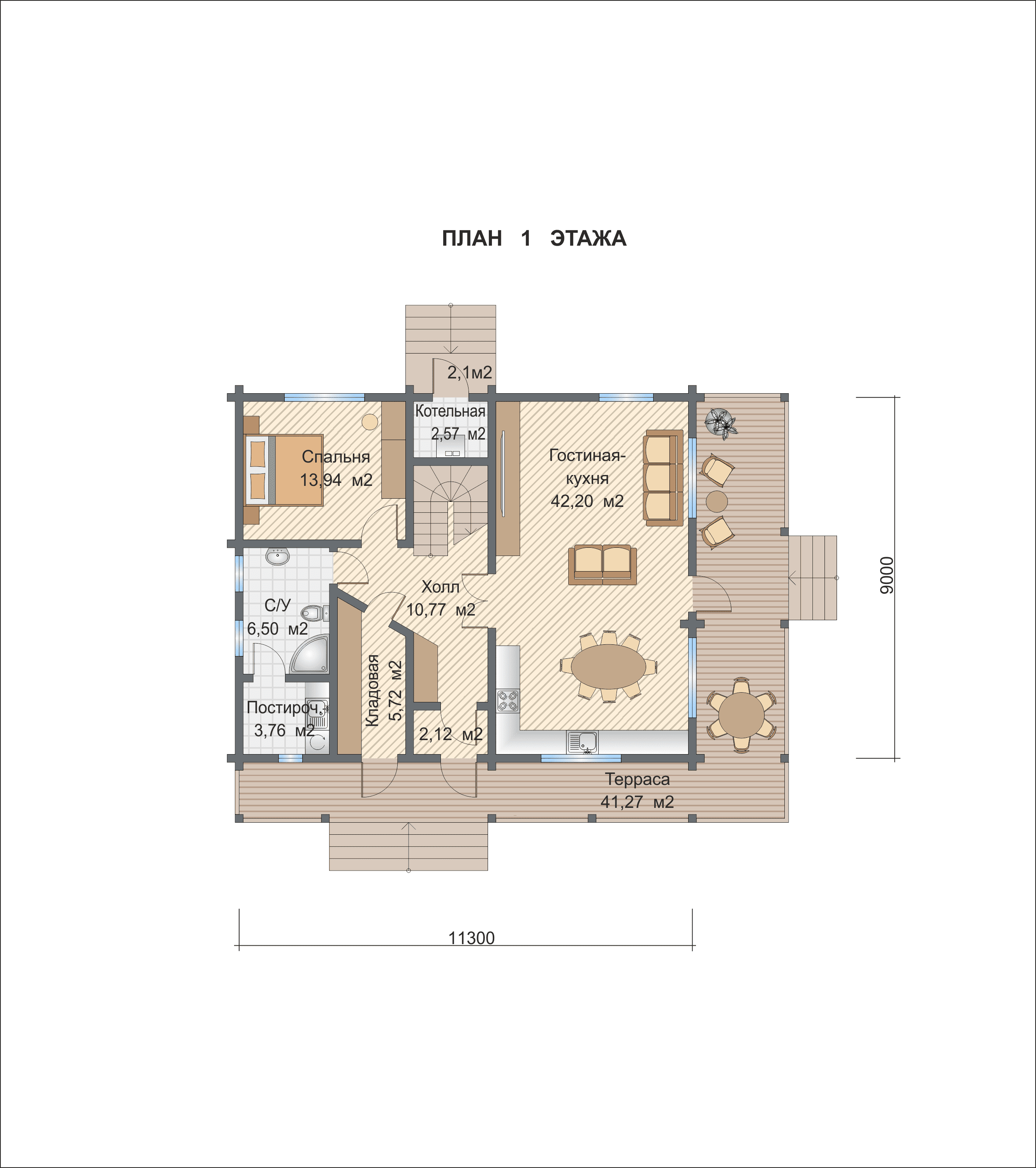 Также, в доме есть большая гостиная, совмещенная с кухней-столовой.