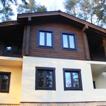Для возведения второго этажа коттеджа используется клееный брус из лиственницы и кедра.