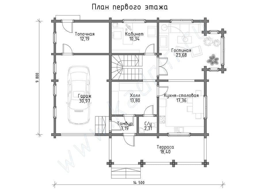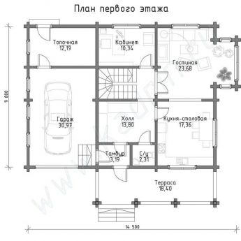Также, в доме есть большая гостиная, совмещенная с кухней-столовой.