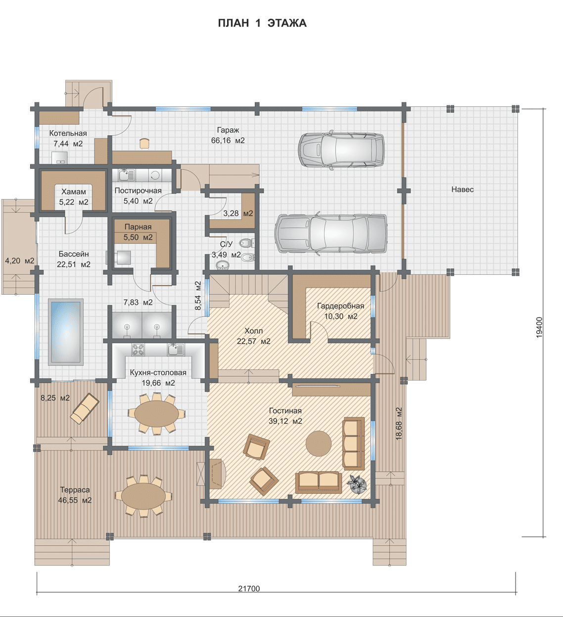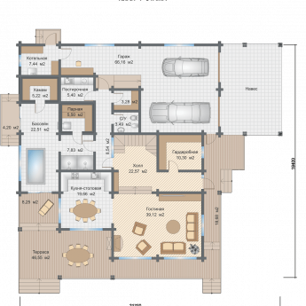 Также, в доме есть большая гостиная, совмещенная с кухней-столовой.