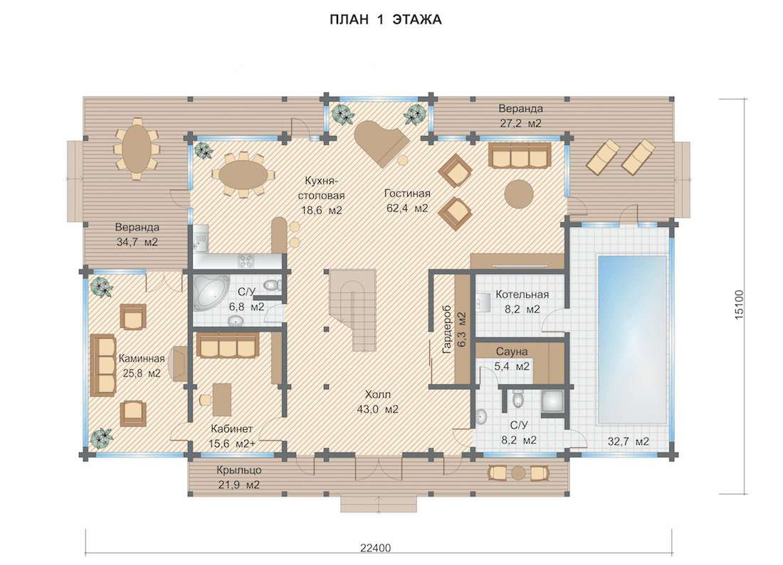 Полезная площадь проекта "Турин" - 494,4 кв.м. По проекту "Турин" - двухэтажное здание, которое также оснащено большим крыльцом, двумя уютными верандами. Площадь крыльца составляет - 21,9 кв.м, общая площадь двух веранд - 61,9 кв.м. Отличительной особенностью планировки проекта "Турин" является удобное расположение бассейна, оснащенного выходом на большую веранду, где можно расположить зону отдыха.