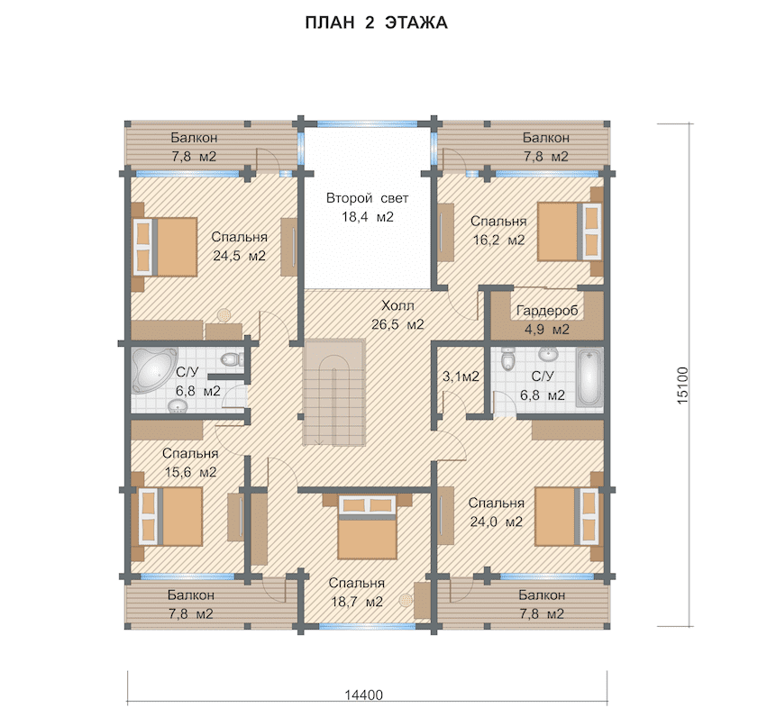 По проекту в здании есть 4 спальни + 1 мастер-спальня, которые можно переоборудовать под другие любые необходимые помещения. Каждая из спален имеет собственный балкон, площадью 7,8 кв.м. Также дом оборудован 4-мя С/У.